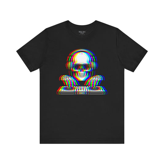 EDM Skeleton Shirt – Neon DJ Skull Glitch Tee