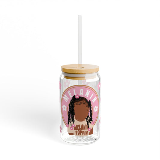 Melanin Poppin Libbey Glass Can – 16 oz Floral Iced Coffee Cup with Bamboo Lid & Straw