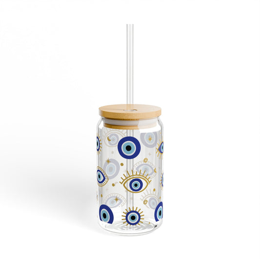 Evil Eye Glass Cup With Bamboo Lid and Straw –16 oz Iced Coffee Tumbler
