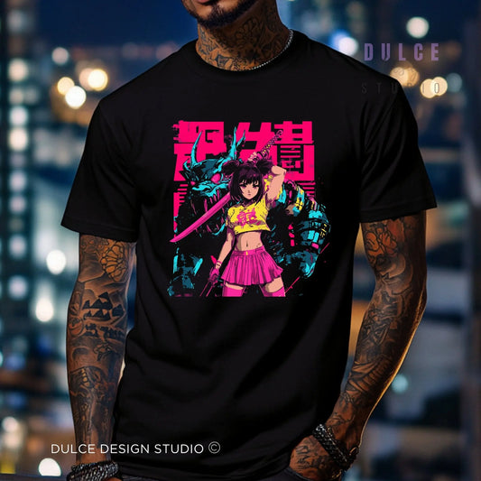 Mecha Girl Graphic Tee – Cyberpunk Anime Samurai Shirt